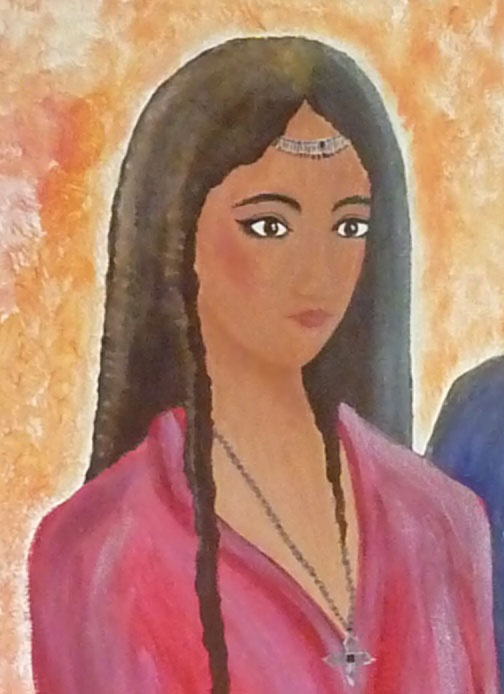 Mein eigener erster Kontakt mit Lady Nada: Während meiner Ausbildung in Medialität gegen Ende 2012 spürte ich während einer Meditation ganz zarte und feine Finger von sehr feinstofflichen Frauenhänden, die meine inneren Augen berührten. Sie bearbeiteten und reinigten intensiv meine feinstofflichen Augen. Ich ordnete die Hände zuerst wegen dem Gefühl der Zartheit und Feinheit einem Engelwesen zu, obschon es sich eigentlich mehr wie sehr feine, menschliche Frauenhände anfühlte, die an mir arbeiteten. Ich nahm innerlich sehr intensive, feurige Farben war, mit Orange als stärkstem Farbton neben rot und gelb, was ja auch wieder zusammen Orange gibt. Aus dem Nichts tauchte innerlich plötzlich wie ein Flash kurz das sehr klare Bild einer jungen, wunderschönen, orientalischen Frau auf, vermummt mit einem Schleier vor Nase und Mund und mit dunklen Augen und Haaren. Ich hatte keine Ahnung, was das bedeutet, bis ich meine Eindrücke in der Austauschrunde äusserte. Danach kam Debora, eine Mitschülerin, ganz aufgeregt zu mir und zeigte mir ein Foto ihres neuesten gemalten Bildes zu den aufgestiegenen Meistern, das im Entstehen war. Es war die Gestalt und das wunderschöne Gesicht von Lady Nada mit dunklen Augen und Haren. Sie erklärte mir ganz aufgeregt und begeistert, dass sich Lady Nada auch bei ihr zuerst mit einem Schleier vor der Nase gezeigt und erst während dem Malen diesen gelüftet hätte! Jetzt wurde mir einiges klar. Es waren die feinen Hände von Lady Nada gewesen, die an meinen inneren Augen arbeiteten und mir so einen ersten inneren Blick auf ihr Gesicht gewährten. Ich war beeindruckt von der Schönheit und der feinen, sehr liebevollen Ausstrahlung von Lady Nada auf dem gemalten Bild von Debora. Seit dann kann ich sie immer wieder mal medial wahrnehmen bei Heilenergieübertragungen oder in Meditationen. Hier das gemalte Bild von Debora Kim Fehr von Lady Nada: